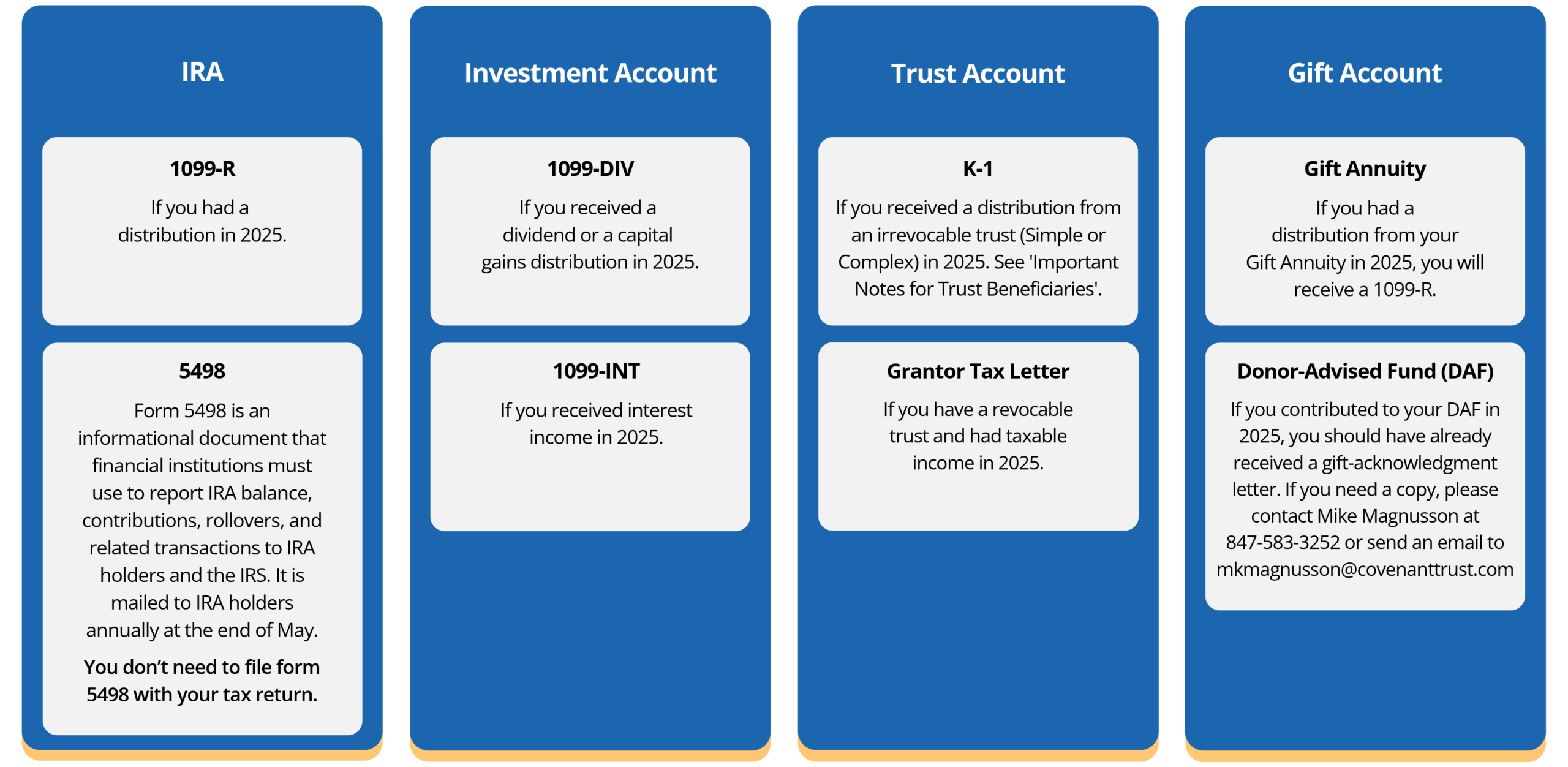 The tax forms you receive from Covenant Trust depend on the types of accounts you hold with us and your account activity throughout the year. Check the table below for a quick guide to which forms you may receive.